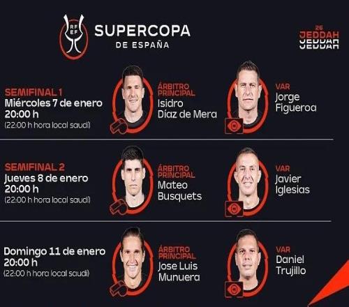西班牙足协官方公布了西超杯半决赛和决赛裁判安排,迪亚斯-德梅拉将执法巴萨vs毕尔巴鄂竞技,马特奥-布斯克茨执法马竞vs皇马,何塞-穆努埃拉将执法决赛。西超杯半决赛和决赛裁判